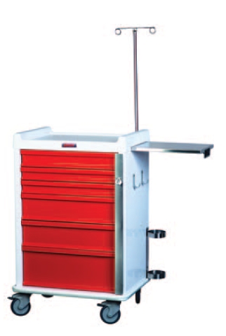Standard Features: Designed and built for safe use in the strong magnetic fields present in Magnetic Resonance Imaging (MRI) suites 1. Tested by independent testing authority to 3 Tesla level 2. Meets American Society for Testing and Materials (ASTM) International, Designation: F2503-05 definition of ¡°MR-Conditional 3. Cabinet painted gloss white with MRI identification sticker applied 4. Low-ferrous, ball-bearing, full extension drawer slides 5. Low-ferrous 5¡å sealed ball-bearing casters; full swivel ¨C one with brake, one directional 6. Stainless steel breakaway locking system 7. Breakaway lock seals, numbered, yellow, pkg-50 8. Full wrap-around vinyl bumper 9. Stainless steel pull-out shelf 10. Replaceable plastic top with integrated push handles 11. Cart is delivered fully assembled with pre-threaded accessory mounting holes 12. MR-Conditional accessories available 13. Latex free 14. Hard-baked powder coat finish