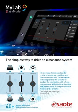 | Esaote’s new ultra-performance MyLab™9 Platform ultrasound system is designed to support a full range of shared service diagnostic imaging environments. Take ultra-control of your images with unique visualization tools, and view results with clarity and sensitivity to help make more informed clinical decisions. Experience the ultra-comfort of Italian-designed ergonomics and an ultra-easy user interface that increases productivity.