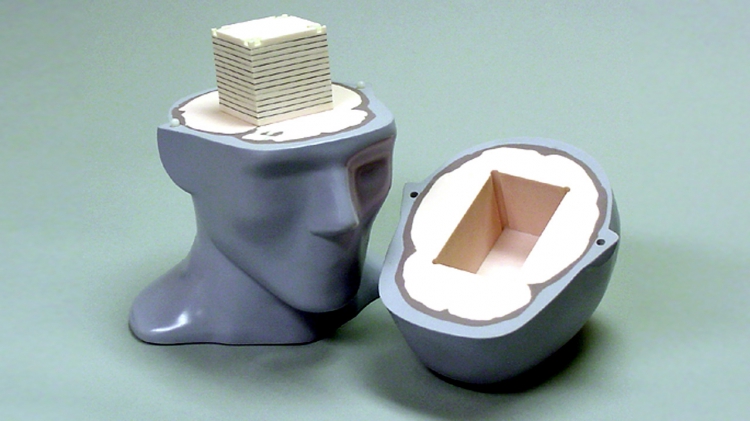 The CIRS Radiosurgery Head Phantom was designed to improve the accuracy of treatment plan verification in radiosurgery. It allows for 3D dose verification in a large cranial volume. The Phantom is manufactured from proprietary epoxy materials and contains brain, bone spinal cord, vertebral disks and soft tissue. Linear attenuations of the tissues are within 1% of actual attenuations from 50 keV to 25 MeV. The standard 6.4 x 6.4 x 6.4 cm film stack contains 13 levels of X-ray or Gafchromic? film to evaluate accuracy of 3D dose distribution. It can be interchanged with an equivalent gel dosimetry cassette or TLD holder. Two brain-equivalent spacers allow the user to locate the cassette in one of four different positions. Features; ? Verification of intracranial dose distribution ? 3D isodose verification ? Commissioning and comparison of treatment planning systems ? Verification of individual patient treatment plan ? Teaching tool for Gamma Knife and Radiosurgery