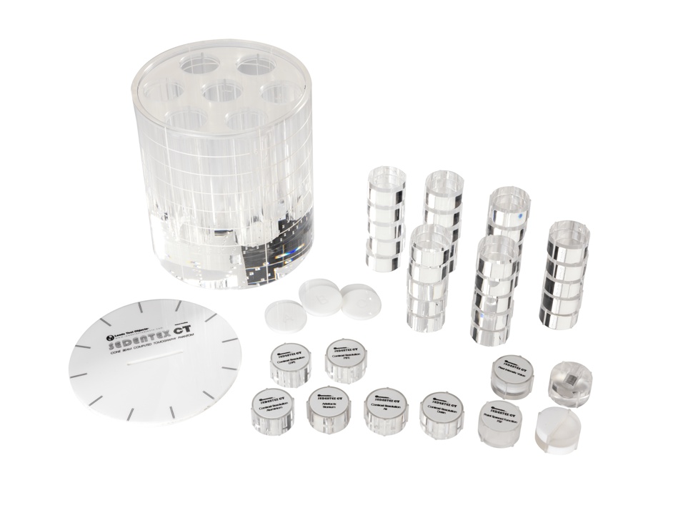 A PMMA cylinder (160 mm diameter) with recesses to house test inserts. Within the body of the cylinder are features for the following tests; Noise/Uniformity – The lower section of the phantom is uniform PMMA (density 1.20 +/- 1.00%) Geometric Distortion – An array of 2.0 mm diameter, 3.0 mm deep Air gaps are uniformally pitched through one slice of the cylinder Test Inserts are included to perform the following measurements: Spatial Resolution – Line Spread Function (LSF) – PMMA/PTFE interface – Point Spread Function (PSF) – 0.25mm diameter stainless steel wire suspended in air – LP/mm – alternating Aluminium/polymer (XY) (1.0 to 5.0 LP/mm) – LP/mm – alternating Aluminium/polymer (Z) (1.0 to 5.0 LP/mm) Contrast Resolution – 1.0, 2.0, 3.0, 4.0, 5.0 mm diameter rods suspended in PMMA Pixel intensity – 10.0 mm diameter rods suspended in PMMA Beam Hardening Artefacts – A line of three 5.0 mm diameter rods of Ti and Pb suspended in PMMA Blank PMMA insert